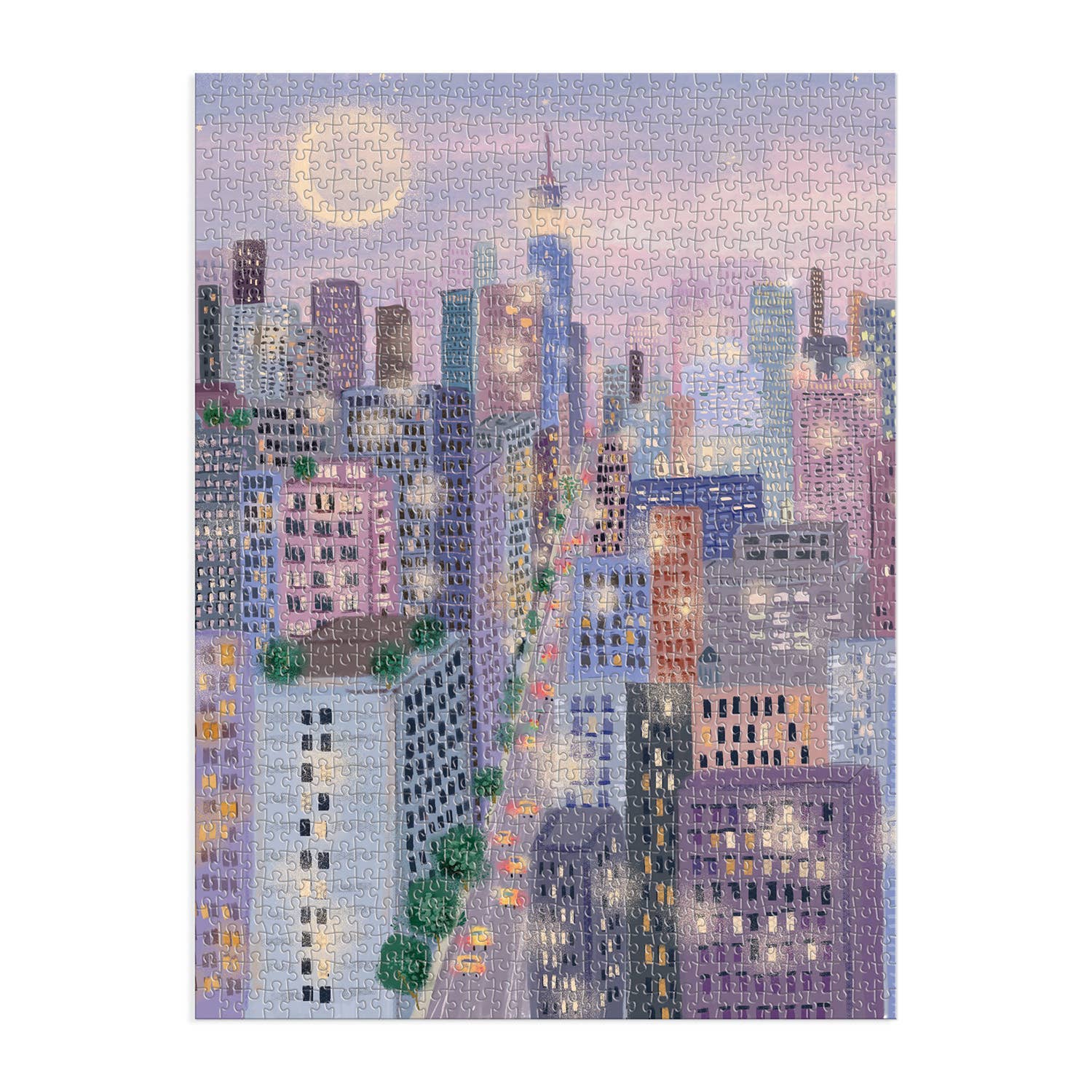 The City Lights 1000 Piece Puzzle features a lavender lit city scene at night by artist Joy Laforme. Galison puzzles are packaged in matte-finish sturdy boxes, perfect for gifting, reuse, and storage.
