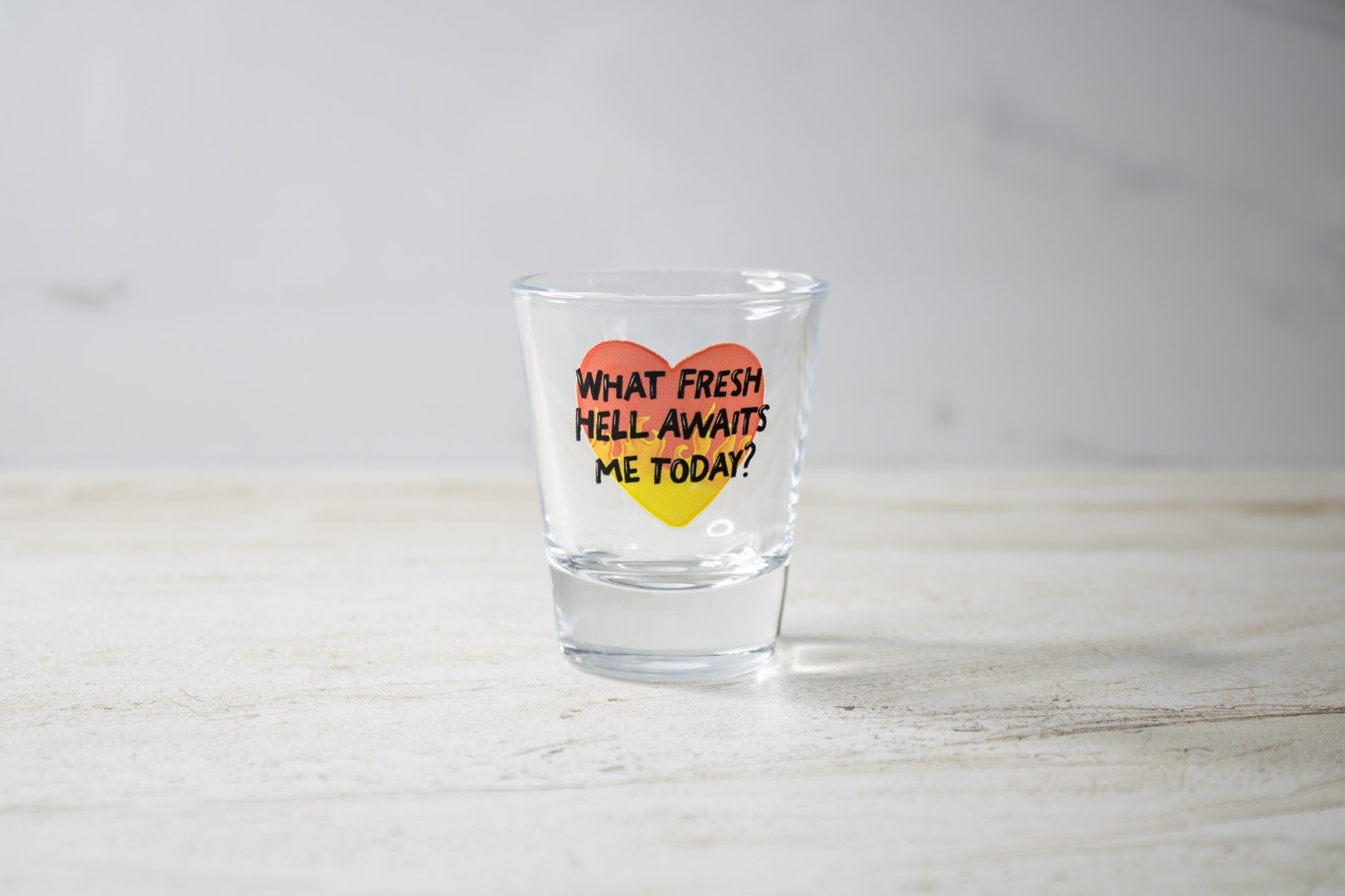 With a bold, funny design on a durable 1.5 oz glass, this one’s made for anyone who meets chaos with humor and a drink in hand.